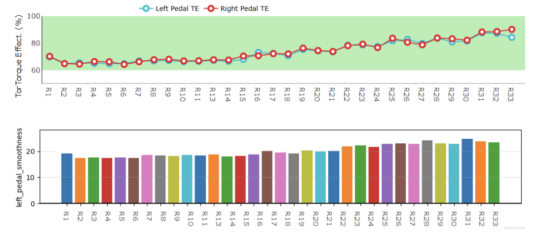 Both pedal smoothness and TE increased progressively with power. Improvements became more consistent above approximately 70% of estimated threshold power. This is consistent with literature showing linear increases in EMG RMS amplitude with intensity.